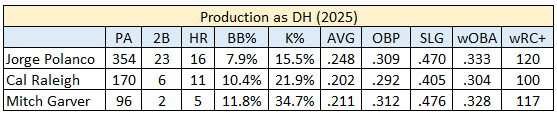 Sure, Polanco could occasionally play in the field. But based on his availability history and what advanced metrics say about his defense, the 12-year veteran makes more sense as a DH. Besides, he was Seattle’s main guy at the position in 2025.