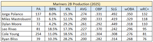 Three players illustrated below with above average production as second basemen - Polanco, Moore, and Miles Mastrobuoni - accounted for 242 plate appearances at the position. But that’s 13 fewer than rookie Cole Young, who got off to a respectable start before seeing his role diminish late in the year.