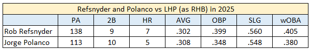 Just to be clear. In no way am I suggesting Refsnyder will be a plug-and-play replacement for the switch-hitting Polanco. Still, his platoon success suggests he could at least partially mitigate the loss of Polanco’s recent productivity versus lefty pitching.