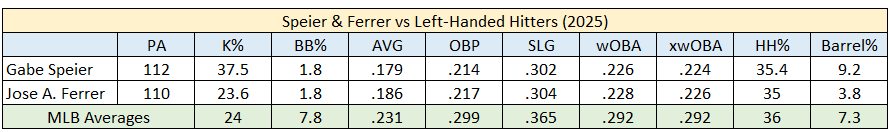 Ferrer was extremely effective against lefty bats. With the exception of strikeouts, the Dominican Republic native limited opponents to a slash line that was very similar to Speier’s and much better than the MLB average in nearly every category.