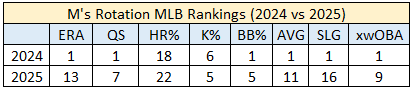 In 2024, the Mariners led MLB by a large margin with 92 quality starts - just three shy of the club record set in 1990. But last year, the rotation’s 67 quality starts were seventh-best. Good, but not great compared to the previous campaign.