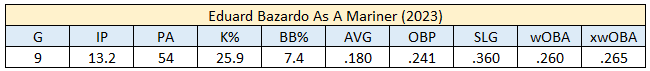 During his brief time as a Mariner, Bazardo’s 25.9-percent strikeout was fifth-best on Seattle’s staff in August-September. Ahead of him were Speier (33.8-percent), Muñoz (30.3-percent), Brash (28.4-percent), and Campbell (27-percent).