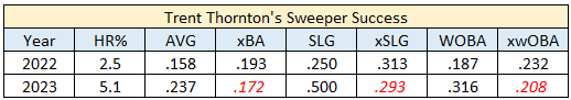 And what’s driving my optimism? Several expected stats suggest Thornton should’ve experienced better results with the sweeper. His xBA, xSLG, and xwOBA were noticeably better than his AVG, SLG, and wOBA last year.
