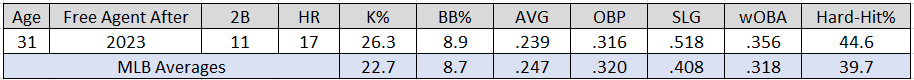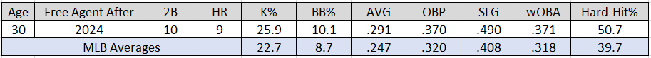 Potential concerns: The foundation of Soler’s offensive résumé is built upon the ability to crush left-handed pitching. The Cuban currently has a .333 AVG/.438 OBP/.889 SLG slash-line when facing lefties compared to .208/.285/.399 against right-handers. His platoon splits were similarly extreme in 2022.