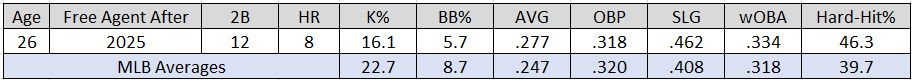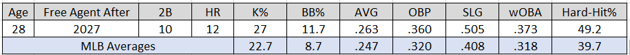 Selling points: The right-handed hitter’s hard-hit rate is top-25 in the majors and would rank second on the Mariners behind Julio Rodríguez (52.9%). Furthermore, Vaughn controls strikeouts and draws walks at a league-average rate. Only 12 players have more doubles than the 25-year-old.