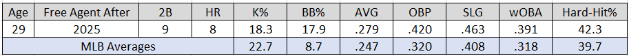 Selling points: Wade has demonstrated an ideal blend of plate discipline and offensive productivity this season. The left-handed hitter currently has one more walk (44) than strikeouts (43). Only Luis Arraez and Juan Soto have a higher OBP than the Baltimore, MD native.