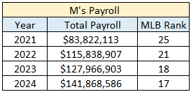 In reality, Seattle’s payroll ranking remained relatively unchanged last offseason. Sure, the dollars went up. Yet, the organization remained in the upper-teens.