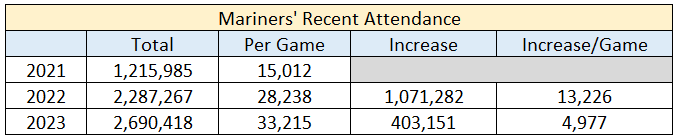 An increase of 625 fans/game is modest for sure. But it’s important to note the 2023 average rose to 33,215 by season’s end. Clearly, Mariners fever was alive and well during the team’s final 39 home games last year. Barring unforeseen circumstances, the same should be true in 2024.