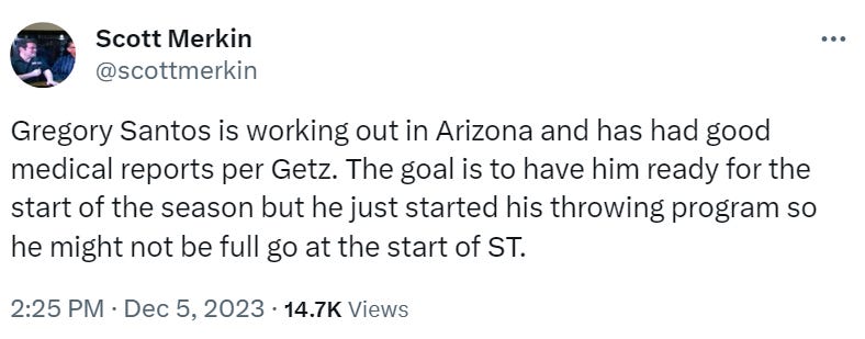 There always seems to be a “yeah, but…” with trades. This time, the pressing issue appears to be Santos’ health. The Dominican spent the final weeks of the 2023 campaign on the IL due to elbow inflammation.
