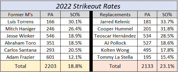 Perhaps a visual will help demonstrate why offseason roster churn made a climb in strikeouts inevitable. The following compares the 2022 strikeout rates of six former Mariners to their replacements and Kelenic. The table’s bottom line foreshadowed a rise in whiffs.