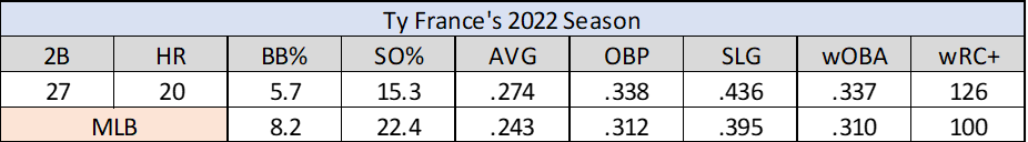To me, France’s offensive skill set makes him an ideal linchpin for Seattle’s lineup. With the exception of walks, he delivered an above-average stat line in 2022.