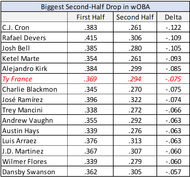 Still, France’s second-half swoon doesn’t concern me. After all, he wasn’t the only recognizable hitter experiencing a late-season decline. To demonstrate this point, I identified notable names with a significant drop in wOBA after the All-Star game.