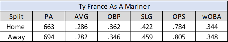 Yes, France has a noticeably lower SLG at T-Mobile Park. But he’s reached base more often in Seattle. Furthermore, his AVG and wOBA were stable.