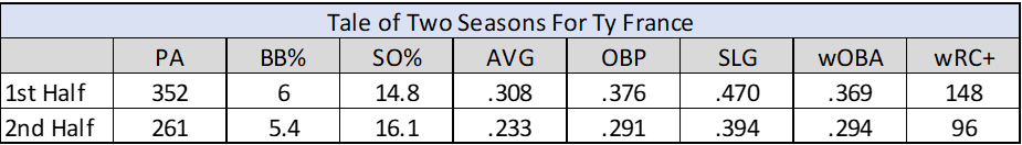 Am I suggesting fans should accept France’s lag in production because others struggled too? No, but a trying half-season isn’t worrisome to me when we’re discussing a hitter with superb season numbers.